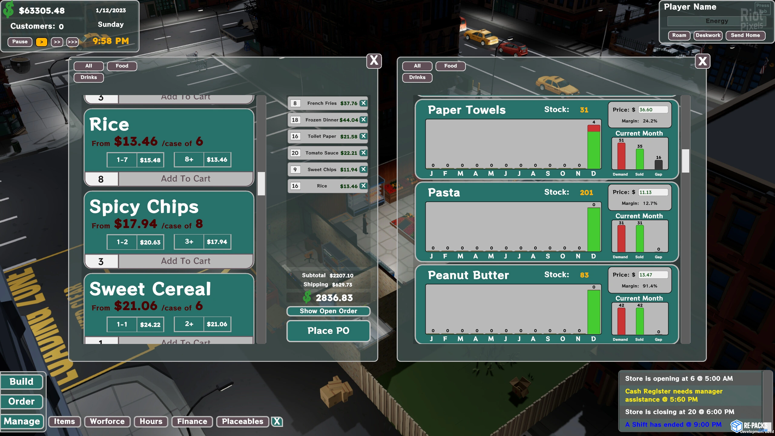 Start with a clean slate and grow your grocery store from the ground up. Buy shelves, hire employees, expand your space, and manage your business your way—whether from behind the register, in the warehouse, or from the comfort of your office.
